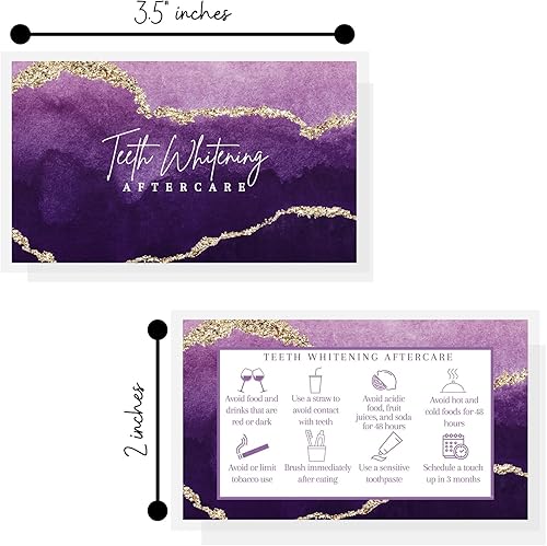Tooth Whitening Aftercare Cards | 50 Pack | Size 2x3.5" inch Business Card | Teeth Whitening Supplies | Purple and Gold Design