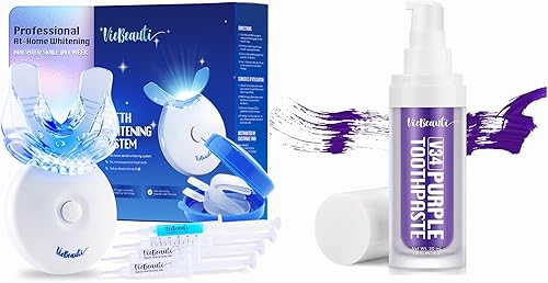 VieBeauti Teeth Whitening Kit with LED Light for Sensitive Teeth + Purple Teeth Whitening Toothpaste Color Corrector, 35% Carbamide Peroxide Gel & Mint Flavor Tooth Whitener Bundle for Brighter Smile