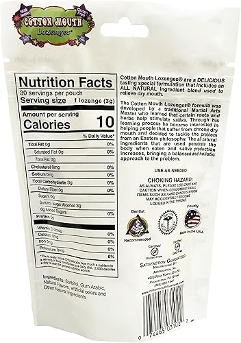 RELIEVES DRY MOUTH SYMPTOMS – The Cotton Mouth Lozenges formula was developed by a traditional Martial Arts Master who learned that certain roots and herbs help stimulate saliva. The all natural ingredients that are used penetrate the body when eaten and help to increase saliva production, bringing a balanced and holistic approach to the problems that exist with dry mouth.