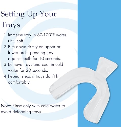 Steps for Tray Molding for Custom Fit: 1. Immerse tray in 80–100 degree (F) water for about 15 seconds to make mouthguard soft. (If tray does not soften you may need to increase temperature of water) 2. Once soft, remove the tray from the water and place on your teeth (upper and lower arch) and bite down firmly 3. While maintaining a firm bite, use your fingers to press the tray tightly against your teeth for 10 seconds 4. Remove tray and place in cold water for 20 seconds to set 5. If your tray does not sit comfortably over your teeth, you can repeat steps 1–4 until it is suitable 6. To maintain your tray, rinse with cool water