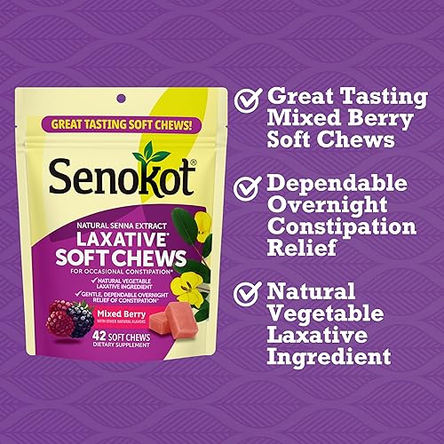 DELICIOUS TASTE: Senokot Mixed Berry Flavored Soft Chews have a delicious taste. Like all Senokot Laxative products, they are produced from the natural vegetable laxative ingredient senna, providing dependable, gentle, overnight relief from occasional constipation.