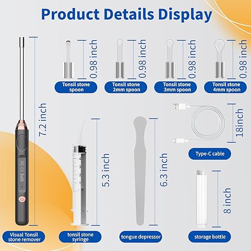 Product list:Visual Tonsil stone remover *1, Tonsil stone spoon*2, Tonsil stone 2mm spoon*2, Tonsil stone 3mm spoon*2, Tonsil stone 5mm spoon*2, Charging cable*1, Tongue Depressor*1, Tongue Depressor*1, Tonsil Stone Syringe*1, User Manial*1. Charging cable*1, tongue depressor *1, tongue depressor *1, Tonsil stone syringe *1, user manial *1.(Tonsil stone spoon later damaged, you can contact us to buy accessories, thank you for your support)