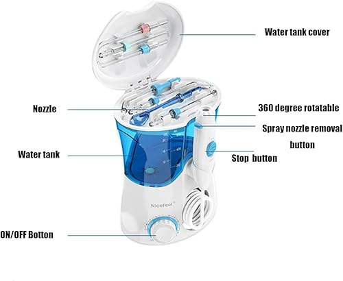SMART CONTROL & SMART USE! Switch on handle controls the flow stop temporarily at any time. 7 water flossing tips included; 90 seconds of 600ML high-volume water capacity.