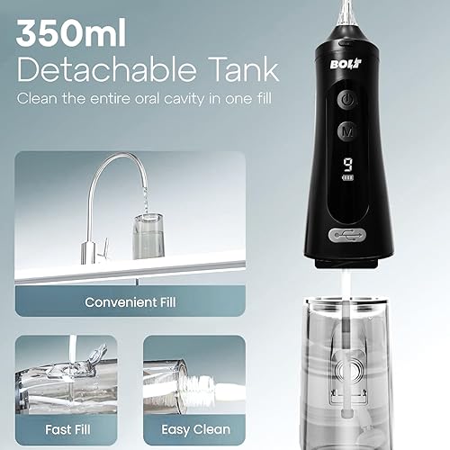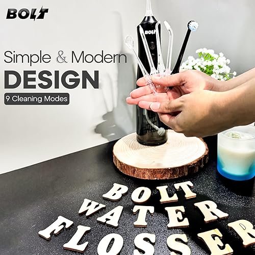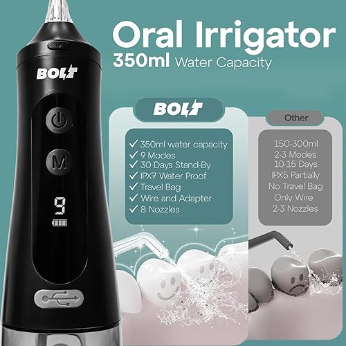 KEY FEATURES: 8 standard nozzles, 9 cleaning modes, BOLT Oral Irrigator comes with a 350ml water tank, supporting twice the storage capacity of other models available in the market. This feature eliminates the need for frequent refills. 360 tip rotation, Digital display with 9 modes.