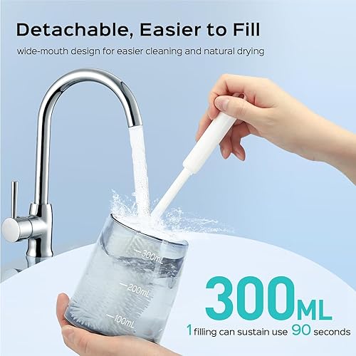 【BPA-Free 300ML Large Tank: No Refills, Easy Cleaning】The 300ml detachable wide-mouth tank provides 90 seconds of continuous cleaning (no repeated refills!). Unlike traditional flossers, its wide opening makes filling and deep cleaning a breeze—no hidden grime left behind. BPA-free material ensures safe use, so you can focus on fresh, healthy oral care every time.
