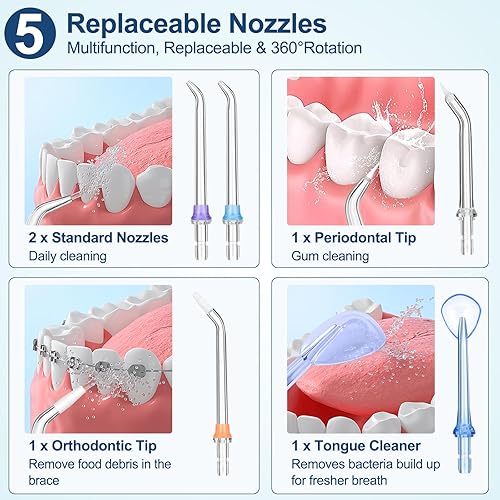 POWERFUL CLEANING : With 5 unique cleaning modes including soft, normal, strong, pulse, and gentle gum massage this dental flosser provides a thorough clean.