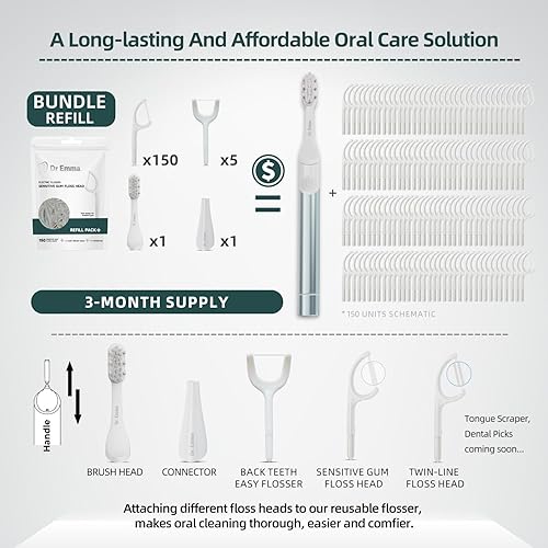 ELECTRIC FLOSSER STARTER KIT: Dr. Emma reusable electric flosser comes with a bonus toothbrush head, 32 replaceable floss head. And included replacable AAA Battery (last up to 3 months). You can also choose Head refills together, which can meet your needs for 3 months at a time.