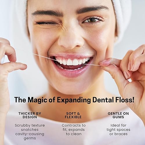 THE MAGIC OF EXPANDABLE DENTAL FLOSS: Contracts to fit snug spaces and then magically expands for a deep clean that kicks more plaque butt than ordinary floss. This stretchy floss material plays nice with your gums and fingers by getting softer as you go