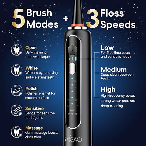 5 Brush Modes & 3 Flossing Speeds: The sonic electric toothbrush not only cleans the surface of the teeth, high-frequency vibrations drives the water generating flow power, can also scour and clean the blind areas in the oral cavity, and wash away dental plaque, 9x cleaner than manual toothbrush.With different modes and speeds,which can meet different needs for your family and different condition for your teeth