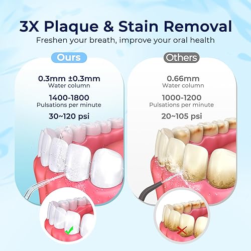 5 Custom Modes for Personalized Care – Switch between Strong, Standard, Gentle, Pulse, and Kids’ modes (30-120 PSI) to suit sensitive gums, braces, bridges,or family use. With 1400-1800 pulses/minute, this water flosser portable removes 99.9% of dental stains, food debris while being gentle enough for kids and seniors.