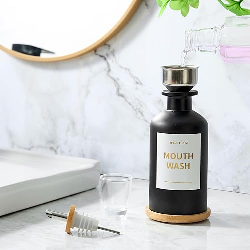 【Multipropose Mouthwash Dispenser Set】: This mouthwash dispenser set for bathroom includes: 2 glass mouthwash bottles, 2 glass cups, 2 pouring spouts, 2 types of label stickers, 2 anti-slip stirps, and 1 stainless steel funnel. Therefore, the mouthwash decanter can hold different liquids, such as hand soap, dish soap, olive oil, vinegar, etc. Plus, the stainless steel funnel is convenient for filling and refilling the mouthwash, preventing spilling mess.