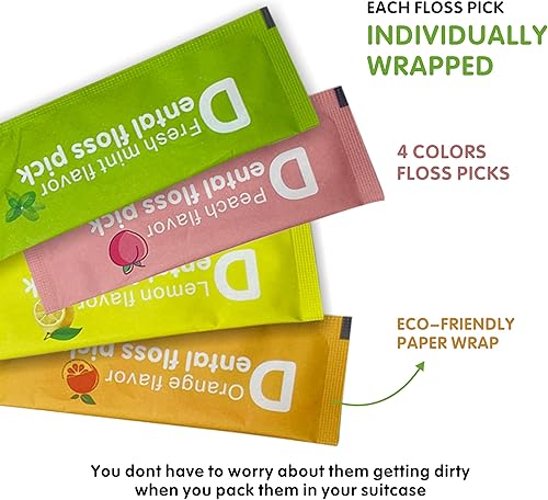 Multiple Flavours:The floss picks are made from natural food-grade fruit flavours-mint,peach,orange and lemon,leaving a light fruity fragrance between your teeth.Different colours of floss sticks are individually packaged for a different experience