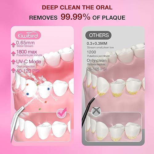 Advanced UV-C Sanitization for Superior Hygiene – Built-in 360° UV-C light sterilizes the tank, pipes, and tips after every use, ensuring a clean and bacteria-free oral care routine. Smart 90-second timer for effective flossing every time.