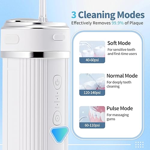 【Powerful Dental Care】Professional dental flosser removes 99% of plaque with 40-140 PSI pressure. This cordless water flosser offers 3 modes: Soft Mode (40-60psi) for gentle cleaning, Clean Mode (120-140psi) for thorough cleaning, and Pulse Mode (60-110psi) for a massaging effect. The water flosser for teeth also features a memory function and 2-minute auto shut-off, simplifying operation, making it a top choice for dental hygiene.