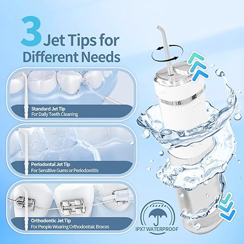 【Compact and Perfect Design】This portable water flosser measures 6.3 x 2.17 x 1.85 inches and weighs only 300 grams, easily fits into bags and suitcases, making it perfect for travel or business trips. Whether you're at home or traveling, this travel water flosser is your ultimate companion for dental care.