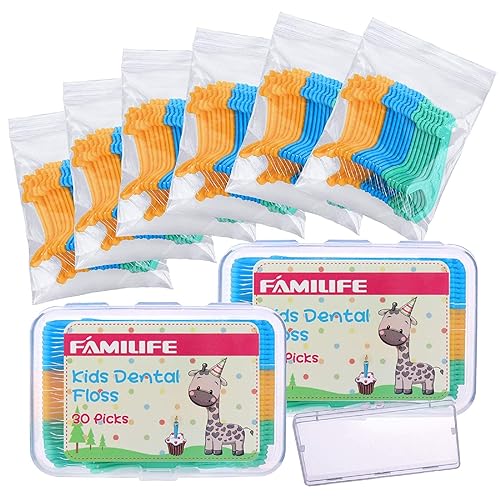 EASY TO USE: FAMILIFE kids dental floss picks are shred-resistant are gentle to gums. A satin-like finish provides nonstick lubrication for easy sliding through even the tightest contacts, removing plaque food particles, protect children's teeth