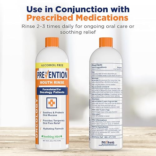 Oncology Specific Formulation - Prevention’s’ over-the-counter (OTC) oncology mouth sore mouthwash has been formulated for use by patients going through chemotherapy and radiation treatment. These treatments can result in uncomfortable mouth sores, ulcers, dry mouth, and other oral complications. This gentle alcohol free mouthwash helps soothe, alleviate and control these side effects, while helping to retain moisture and protect the mucosal lining. The perfect mouth sores treatment for temporary relief of minor discomfort and irritated areas in a sore mouth and sore throat.