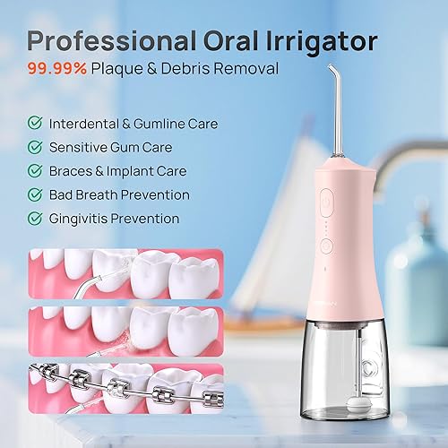 IPX7 Waterproof & Safe: Our water flosser cordless features dual-seal leak-proof technology to supports fully shower-safe with IPX7 rating. Delivers gentle yet effective cleaning for interdental care, sensitive gums, and braces. This water flosser is help to prevent bleeding, fight gingivitis, and whiten teeth. Perfect for travel & home use, and daily oral care routines