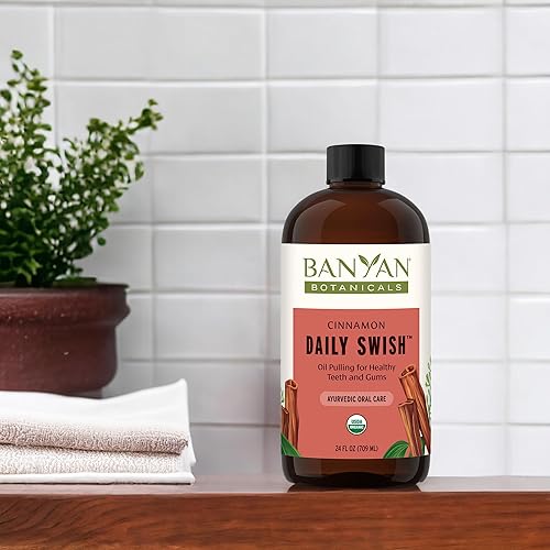 BASED ON ANCIENT Ayurvedic techniques, the simple act of oil pulling for teeth and gums has become a common household oral care practice, alongside brushing and flossing. Use Daily Swish in mint or cinnamon to keep your mouth sparkling clean.