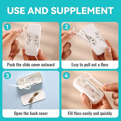 ➤Food Grade Material: Each portable floss dispenser contains 12 floss. Our floss stick is made of food grade TPR+ABS material and has a groove anti-skid design. The floss can withstand high tension without breaking and will not expand the gap between teeth. The tail of the floss stick is designed with a hook, which can also be used as a toothpick.