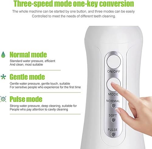 The water pressure is powerful while comfortable, which can brush your teeth thoroughly. This water flosser has 300ml removable water tank, 3 clean modes and 2 rotatable jet tips, is very convenient and practical. It also features memory function, ergonomic handle, sealed and waterproof dental floss, easy to clean.