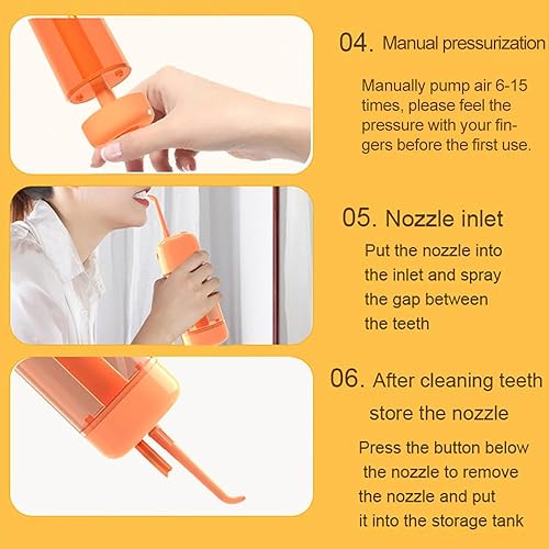 Efficient cleaning: This manual dental flosser utilizes the principle of air pressure to pulse high-pressure water flow, which can penetrate deep into the blind area of teeth cleaning, effectively removing food residue and dental plaque between teeth.