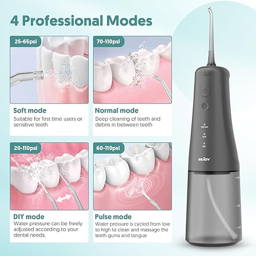 【4 Professional Cleaning Modes For Your Choice】: Soft(25-65psi) - for children or first-time user. Normal(70-110psi) - For effective cleaning. Pulse(60-110psi) - Massage Gum, DIY Mode(20-110psi) 20-120PSI speed can be freely adjusted according to your dental needs. Please choose soft mode when you use this electric water flosser for the first time.