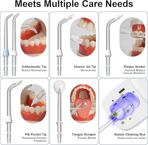 【What You'll Get】The package includes everything you need for a complete oral care experience: 1× Cordless Water Dental Flosser, 6× Versatile Nozzles, 1× Nozzle Cleaning Case, 1× User Manual, and 1× Charging Cable (Note: Adapter not included)